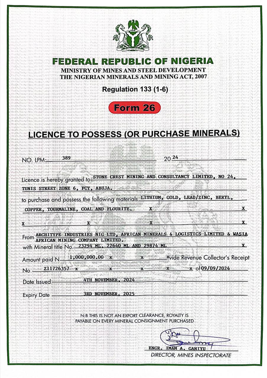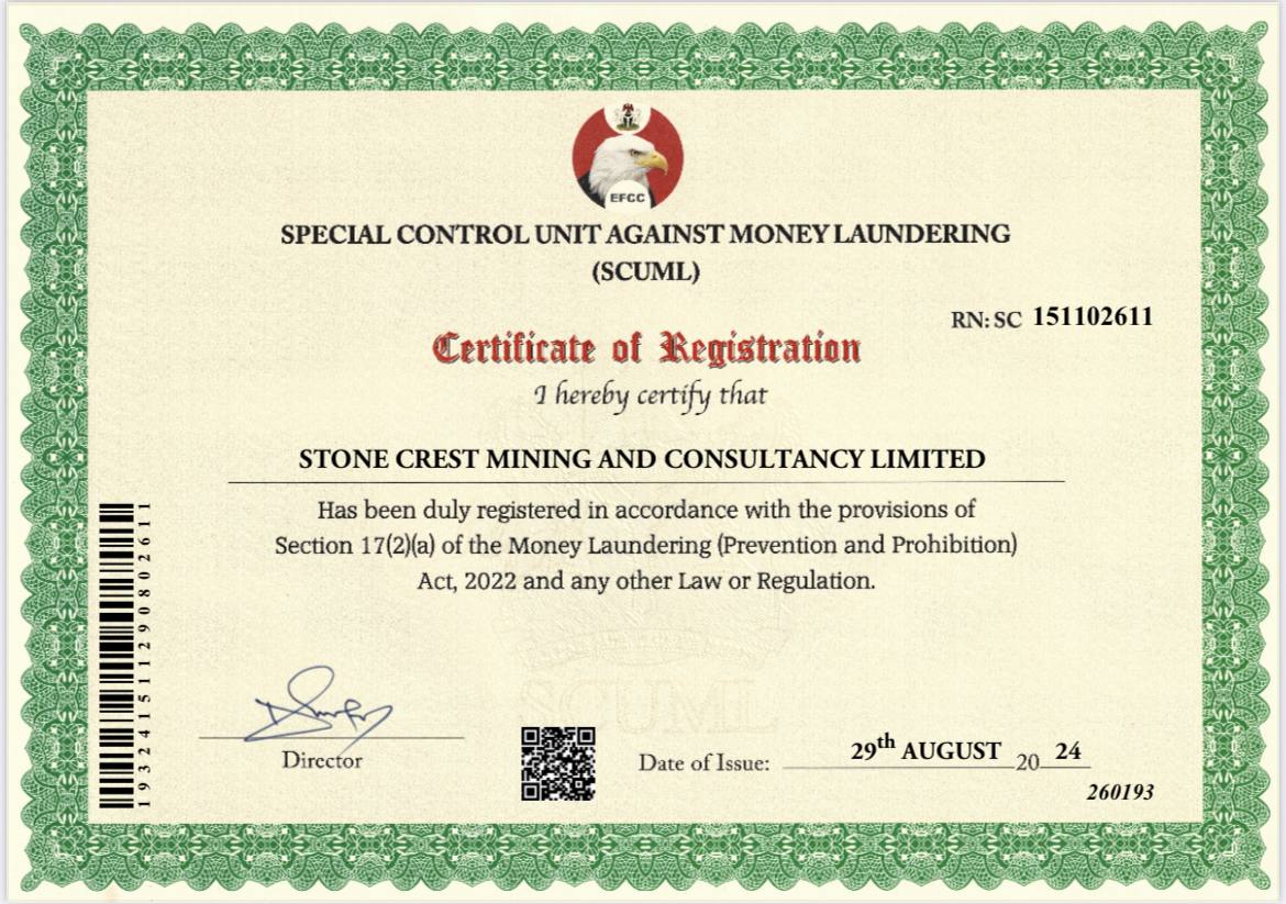 Stone Crest Limited is a Nigerian mining and consultancy company located in Jabi, Abuja. Established on January 25, 2024, the company was founded by a group of investors and geologists who aimed to create a business institution that meets the requirements of international investors interested in Nigeria’s mining industry.